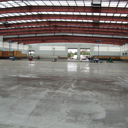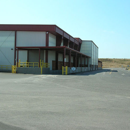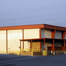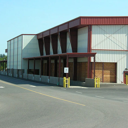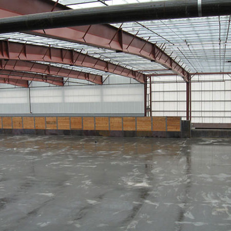 The building is a reverse tapered column 186′ clear span rigid frame including one bay with clear spans of 196′. The building has a lean-to canopy that runs 380 linear feet along one sidewall and wraps 30′ around to the buildings endwall.