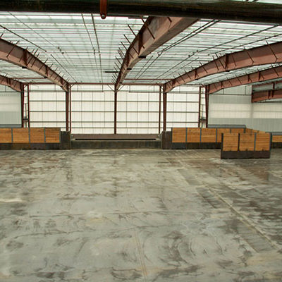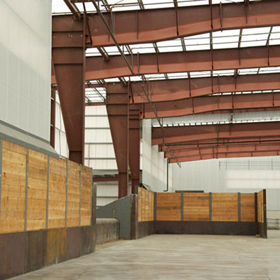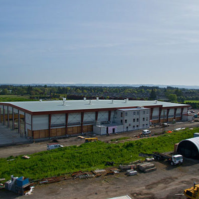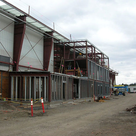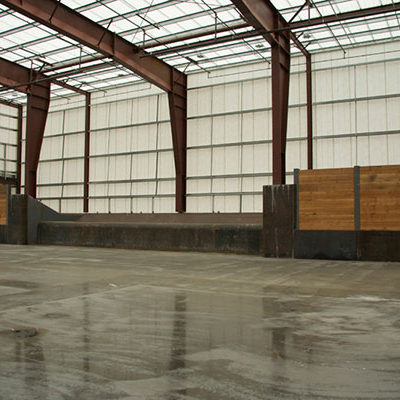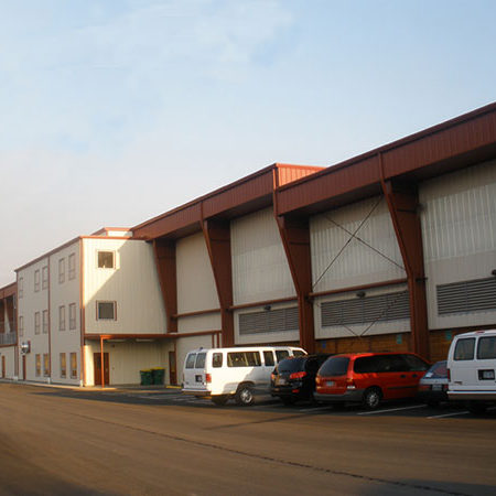 The three-story office structure abuts the main facility and extends into the main building at the third floor with an observation deck. The office roof is a Standing Seam 360 system and the wall system is an Architectural III panel. The main building’s roof is a “Resolite 18 oz. Tread Safe” translucent panel. The main building utilizes 29 ga. liner panel as well as Resolite 7 oz translucent panels full height.
